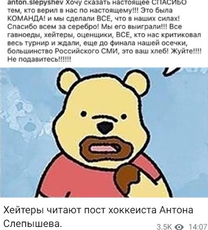 После игры нападающий Антон Слепышев разразился гневной тирадой в адрес критиков сборной («Самый Бодрый»).