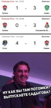 Также добился разгрома и «Сочи», расправившийся дома с «Химками» (4:1). Это третье поражение подмосковной команды подряд после увольнения Сергея Юрана. Зато в старте вышел сын инвестора Илья Садыгов («СРА4ТВ»).