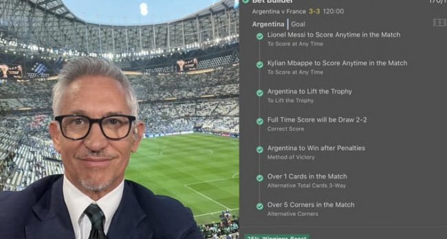 Судите сами: Линекер предсказал в финале голы Месси и Мбаппе, счет 2:2 по итогам основного времени, тотал желтых карточек больше 1.0 и угловых — больше 5.0, а также победу Аргентины в серии пенальти. Коэффициент «системы Линекера» составил 170…