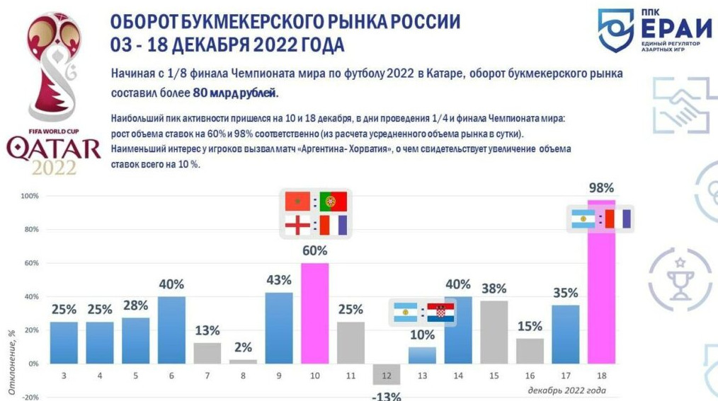 Единый регулятор азартных игр (ЕРАИ) опубликовал статистику российского беттинга по итогам плей-офф чемпионата мира. На финишном отрезке турнира в Катаре оборот российского букмекерского рынка составил 80 млрд рублей.