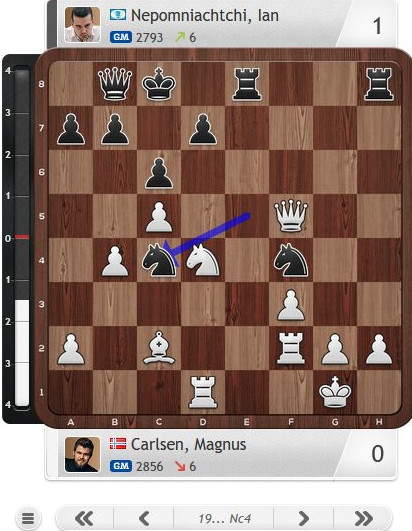 Мини-матч из четырех партий россиянин начал с поражения. Во второй партии у норвежца тоже было преимущество, однако Непомнящий перехватил инициативу, сравнял счет, а в партии №3 черными добыл решающее очко – за счет убийственной жертвы коня на 19-м ходу.