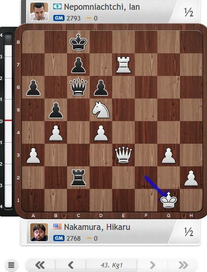 Когда вскрыли конверт с заявкой Непомнящего, там было записано число 13. Но Накамура оказался еще на минуту скупее! Наш гроссмейстер получил черные фигуры, для которых в армагеддоне ничья равносильна победе. Увы, это Яна и сгубило. Здорово разыграв дебют («+2,5» на 15-м ходу!) он не нашел лучшего продолжения, стал осторожничать и потерпел поражение. Чемпионом мира по шахматам Фишера был объявлен Накамура.